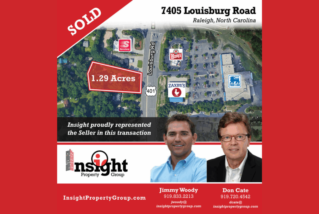 Insight Property Group is pleased to announce the sale of 7405 Louisburg Road, a fantastic development opportunity on Highway 401. Congratulations to the seller, represented by Jimmy Woody and Don Cate. Ready to make your next move in commercial real estate? Contact the Insight team today by calling (919) 833-2200.